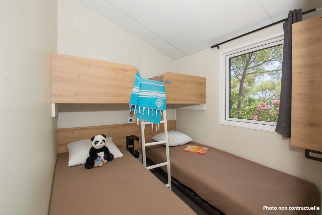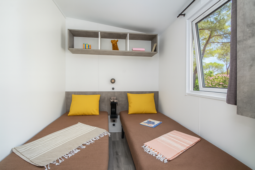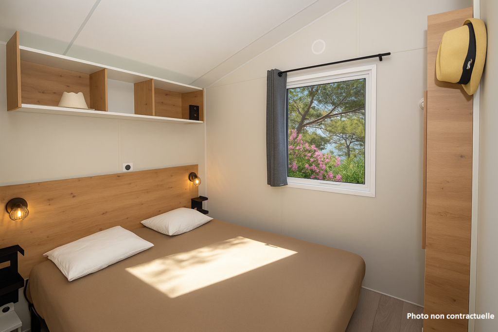 Trænger du til en afslappende pause midt i naturen – kun få skridt fra Middelhavet i det solrige Sydfrankrig? Vores REVE-mobilhome til 4 personer er det perfekte valg til en familieferie eller et ophold med venner på en af de største 5-stjernede familiecampingpladser ved den franske middelhavskyst. Beliggende på en bakketop med delvist havkig tilbyder dette moderne mobilhome alle bekvemmeligheder til et komfortabelt ophold i Provence. Den lyse opholdsstue rummer et fuldt udstyret køkken til lækre middelhavsretter, et spiseområde til hyggelige stunder sammen og en komfortabel sofagruppe med tv, perfekt til afslapning efter en dag på stranden. Soveværelset har en queen-size seng, masser af opbevaringsplads og en værdiboks. Det andet værelse har to enkeltsenge, ideelt til børn eller ekstra gæster. For maksimal komfort er alle REVE-mobilhomes udstyret med omvendt aircondition, så du kan sove køligt – selv på varme sommeraftener. Boligen indeholder desuden et moderne badeværelse med stor bruser samt et separat toilet. Udendørs inviterer den private terrasse med havemøbler til afslapning, udendørs måltider eller blot at nyde det smukke middelhavslandskab. Alle campingpladsens faciliteter og stranden ligger kun få minutter væk. En privat parkeringsplads tæt på dit mobilhome gør det nemt at bevæge sig rundt på campingpladsen og udforske de charmerende byer, strande og skjulte perler i Provence og Den Franske Riviera. Din drømmeferie ved Middelhavet begynder lige her.