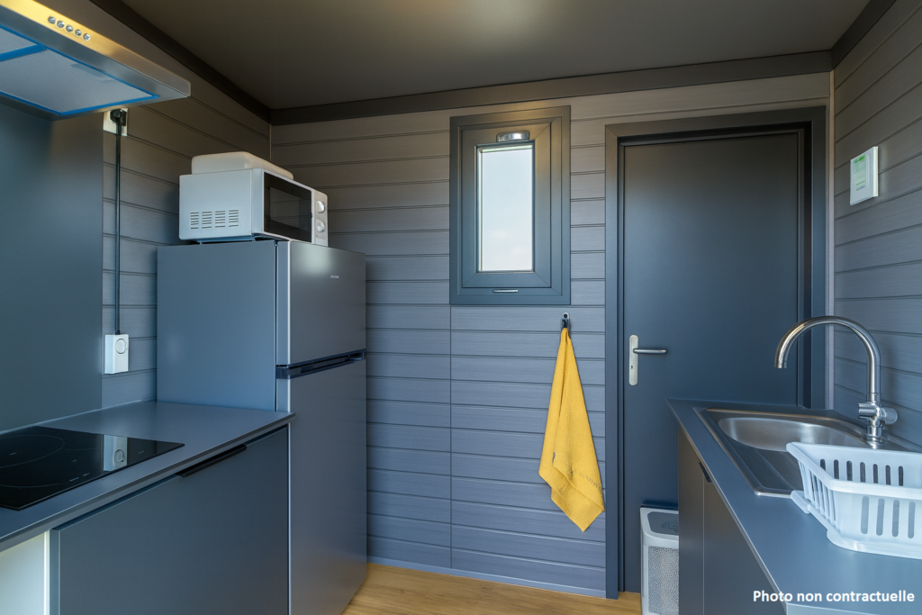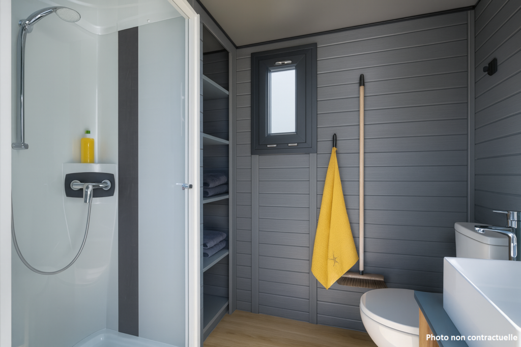 Pensés pour un séjour tout confort, nos emplacements camping avec sanitaires privés côté mer disposent de sanitaires privatifs directement sur l’emplacement : une véritable salle d’eau individuelle avec douche et WC exclusifs. Juste à côté, vous profitez également d’une kitchenette privative comprenant un grand réfrigérateur, un micro-ondes, un évier, une plancha à gaz et même un lave-vaisselle (vaisselle non fournie), pour des vacances sans contraintes.