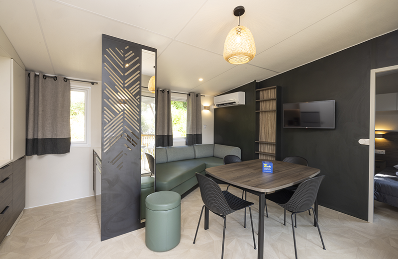 Envie d’une escapade en famille au bord de la mer tout en profitant d’un confort absolu ? Notre mobil home OASIS BIS SPA est fait pour vous ! Avec ses 2 chambres et 2 salles d’eau, ainsi que son spa privatif sur la terrasse, vous profiterez de prestations haut de gamme dans un cadre enchanteur. Niché au cœur de la pinède du camping, dans un écrin de verdure, nos mobil home OASIS BIS SPA offrent de beaux volumes pour des vacances en famille ou entre amis reposantes. Belle pièce de vie, cuisine toute équipée, suite parentale, terrasse XXL… les mobil homes OASIS SPA ont tout pour plaire. Les espaces nuit sont également à la hauteur de vos attentes : une première suite parentale avec lit queen size, douche et WC vous apportera tout le confort nécessaire à un repos bien mérité. La deuxième chambre composée de deux lits simples est modulable, proposant ainsi la possibilité d’un deuxième couchage double. Le petit + de l’OASIS SPA : les draps et serviettes sont fournis ! Les extérieurs ne sont pas en reste ! La terrasse arborée vous promet des moments conviviaux autour d’un bon repas, tout en admirant la vue sur la nature environnante. Et que dire de votre spa privatif, où 4 personnes peuvent confortablement buller à l’abri des regards indiscrets. Bien sûr, une place de parking est également prévue pour votre véhicule. Le clou du spectacle ? La mer est toute proche : seulement 400m vous séparent de la plage de sable fin attenante au camping. Quantités limitées, ne tardez pas trop…
