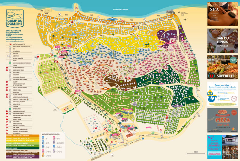 Découvrez le plan complet de notre vaste camping étendu sur 45 hectares entre mer et montagne : emplacements de camping, hébergements, commerces, activités… tout y est ! Vous apprécierez notre visite virtuelle pour vous immerger au cœur de l’ambiance du Camp du Domaine.